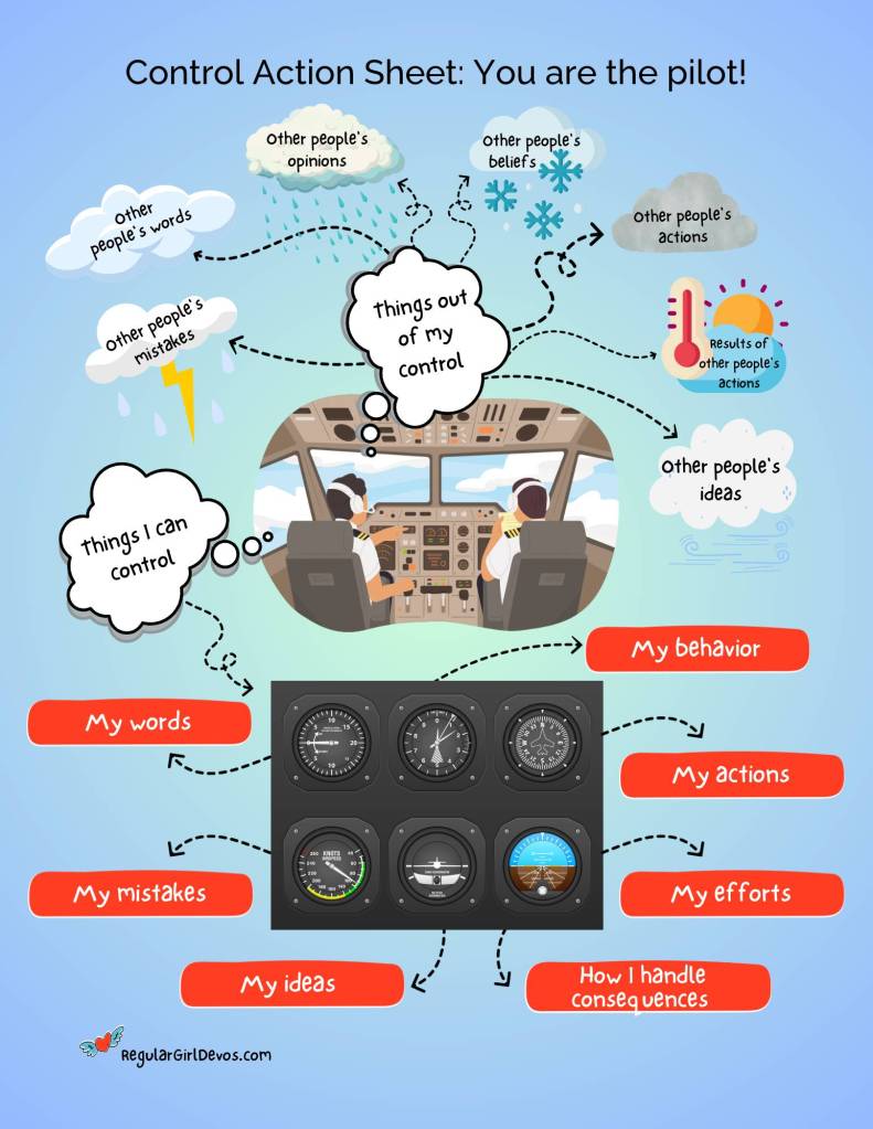 I imagine it’s like being a pilot in the cockpit. You have control over what happens on the plane, like the altitude of the plane, but you have no control over external factors, like the weather. Practice focusing on your circle of control daily.